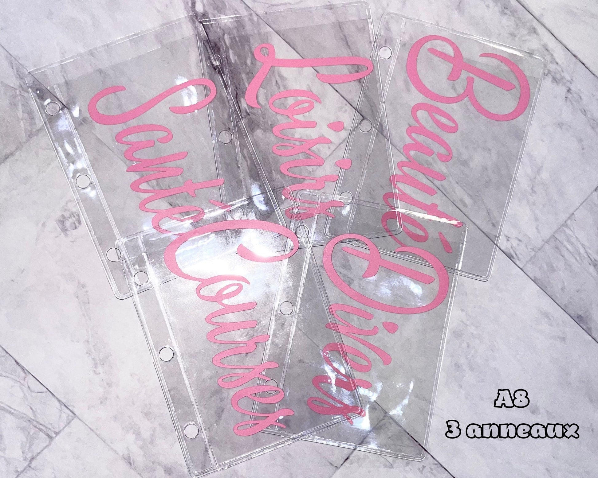 Lot de 5 enveloppes A8 pour les classeurs 3 anneaux personnalisable avec les catégories de votre choix. Idéal pour faire le système des enveloppes budgétaire avec un petit classeur qui s’emporte partout !