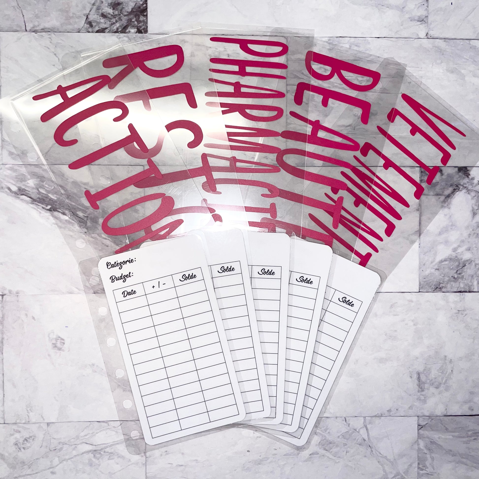 Lot de 5 enveloppes budgétaires transparentes personnalisable format A7 + 5 trackers perforées format A7. Vous pouvez personnaliser les 5 enveloppes avec les catégories de votre choix.