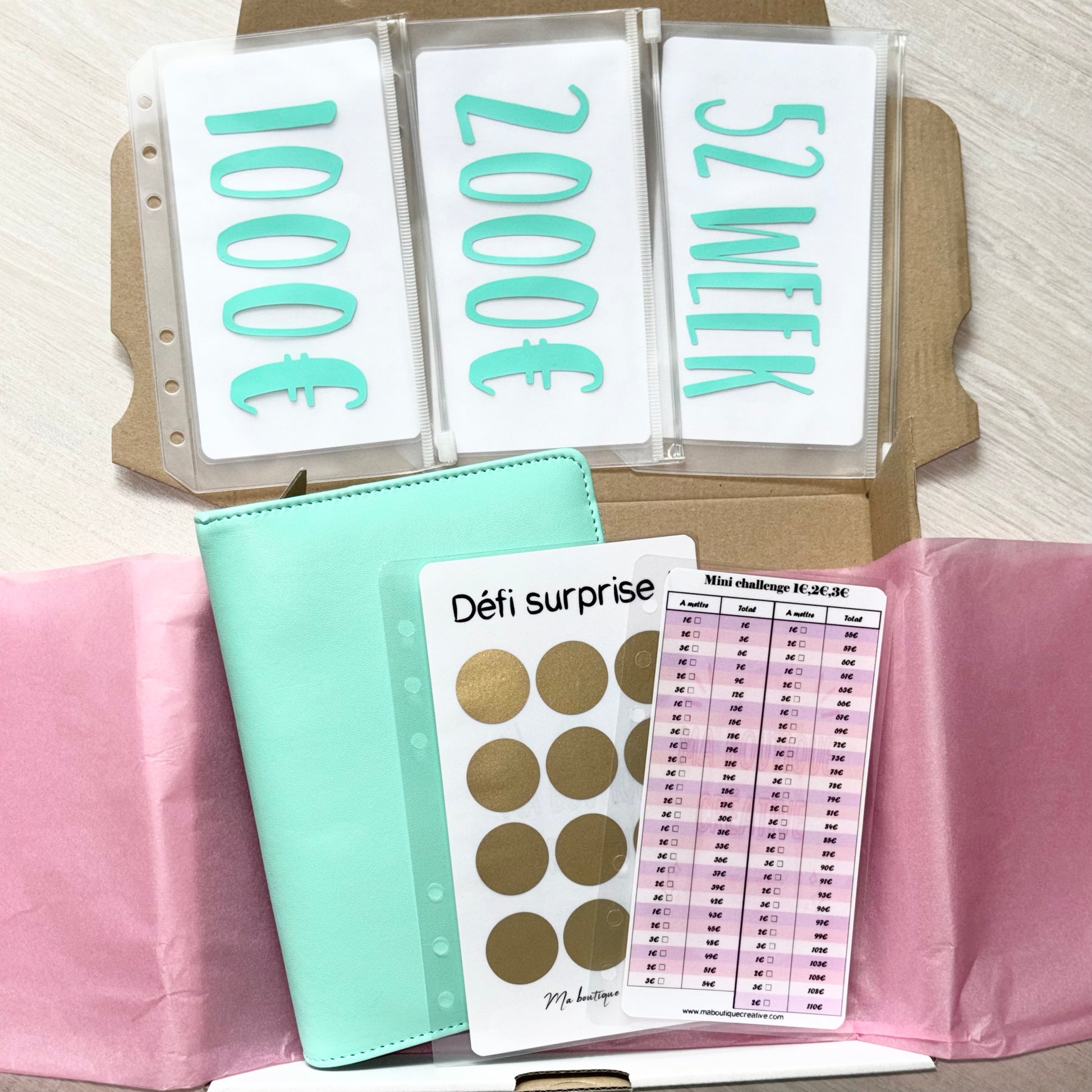 - Un kit challenge 100 enveloppes spécial petit budget 1000€ (1 enveloppe + 1 tracker du défi)