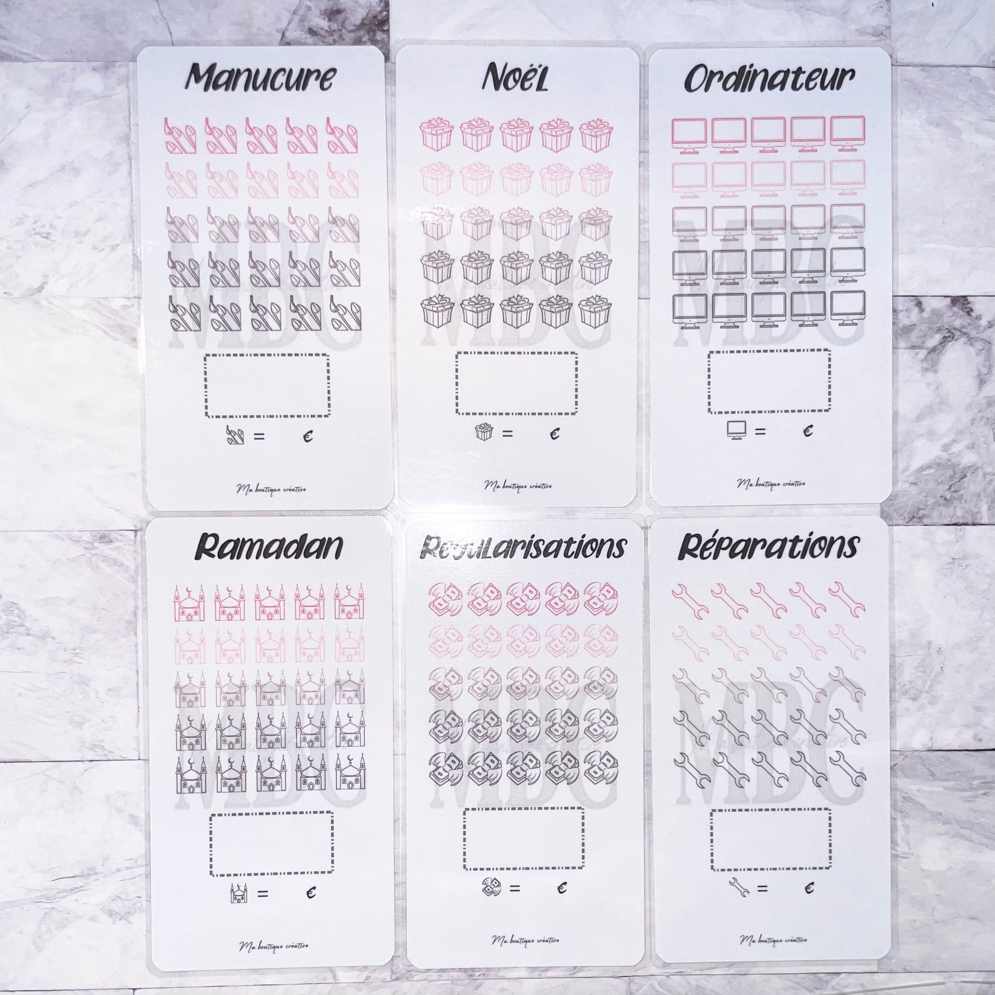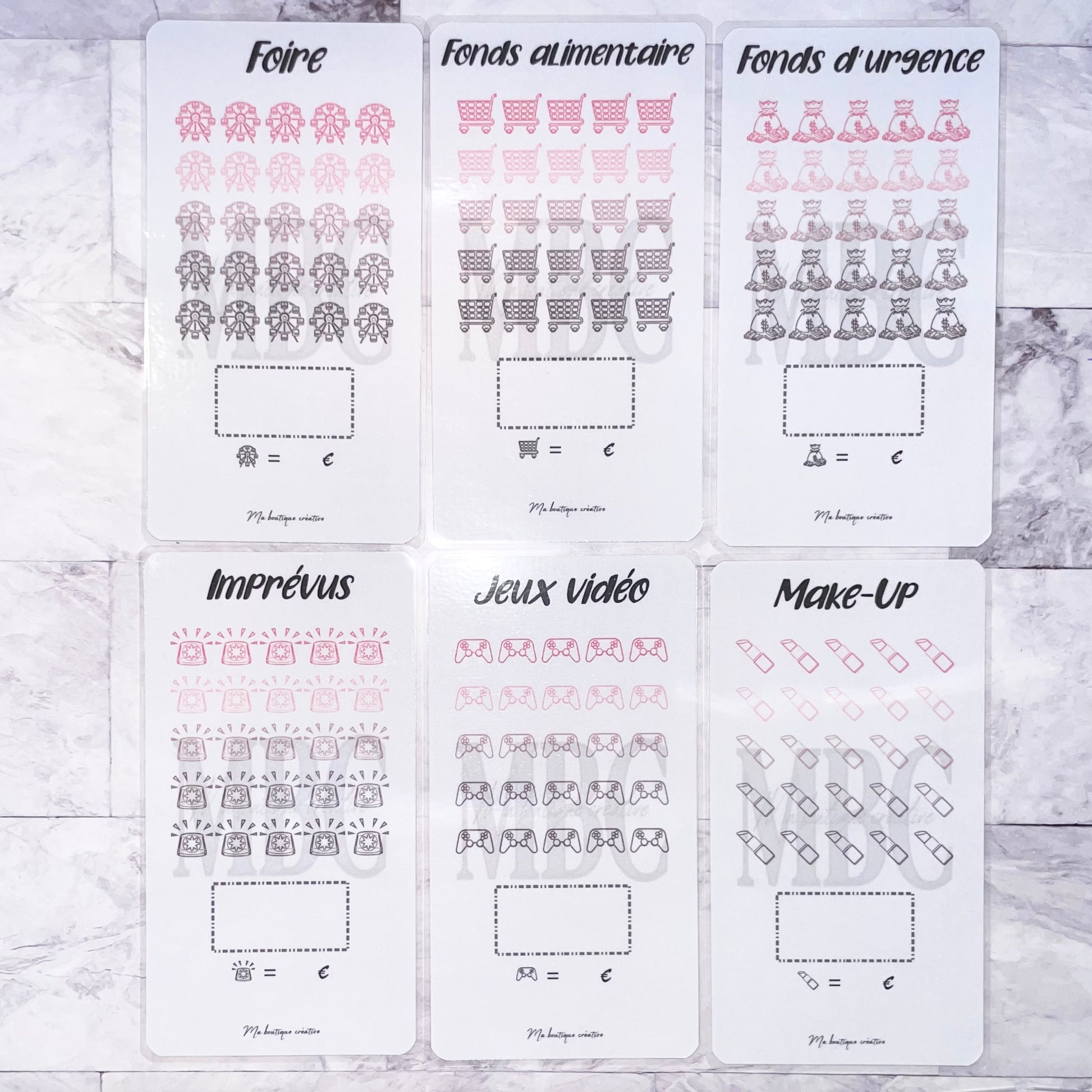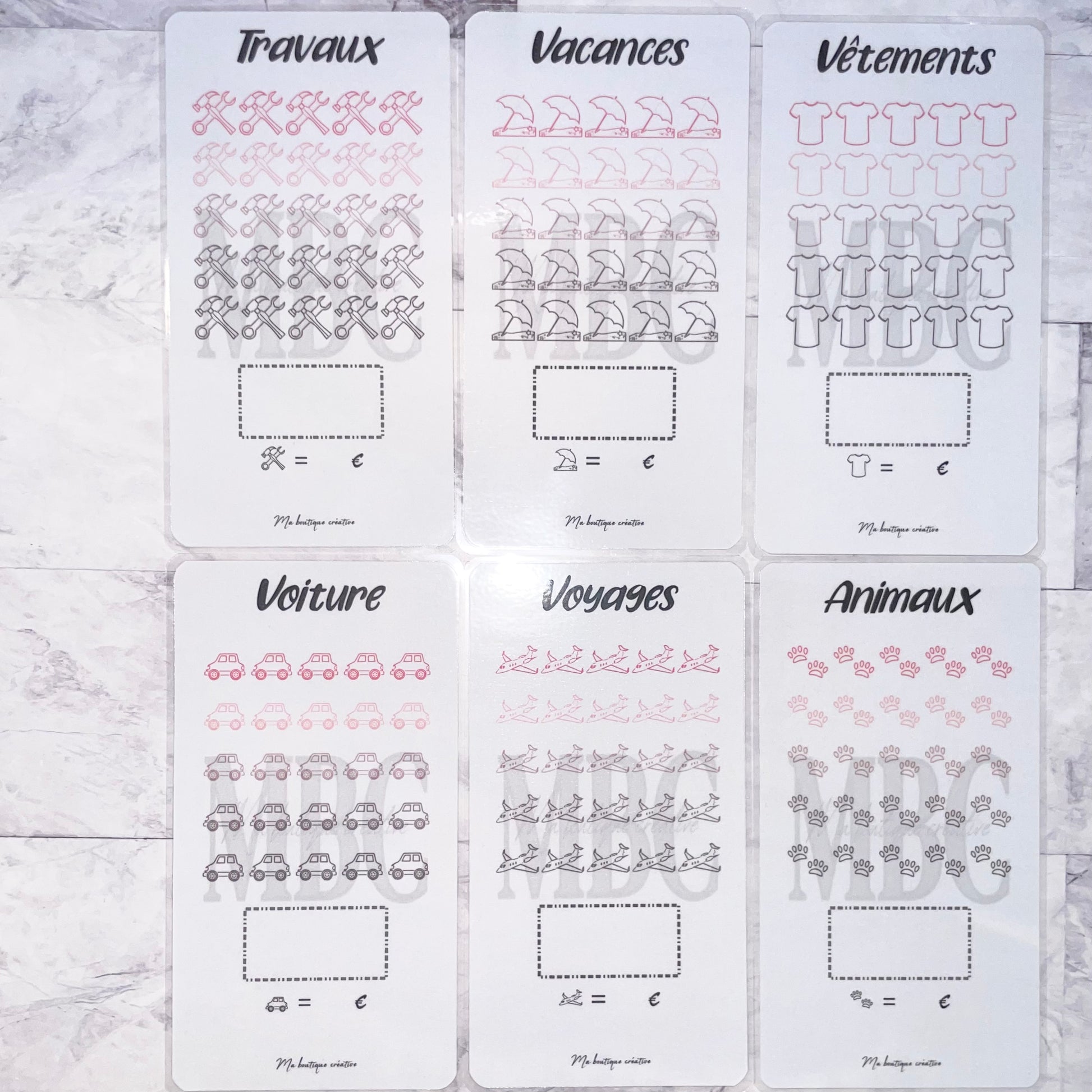 Vous trouverez ici pleins de différents trackers au format A6 pour vos épargnes avec 25 cases dont vous disposerez du choix du montant ! Vous avez également la possibilité (ou non) de prendre le tracker avec une enveloppe zip qui va avec !